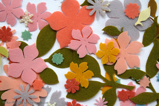 Next step is simple too, I sort and stack the petals to create flowers. Add some flocked leaves. Stitch the flowers together with sequins and seed beads. Sew them onto the bag to complete the 60's styling carrying tote of coolness. Okay, so the tweeded bag adds great texture against the velvety flowers and shimmering sequins. Lovin’ the gray texture against these throw-back colors of the late 50's. Hey, even the sequins are vintage to complete the older than thou and cooler than now look.